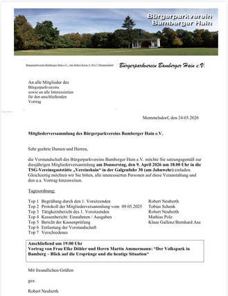 Mit der Mitgliederversammlung am 09. April und mit dem anschließenden Vortrag starten die Veranstaltungen des Bürgerparkvereins. Der Bamberger Volkspark und seine 100-jährige Geschichte ist der Rote Faden dieses Vereinsjahres.