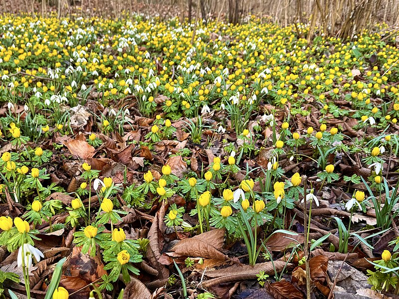 Die Pflanzengattung "Winterlinge" (Eranthis) besiedeln auf vielen verteilten Flächen in dieser Vorfrühlingsphase den Hainpark. Dazu gesellen sich die Schneeglöckchen (Galanthus), eingestreut oder auf eigener Feldbesiedlung.