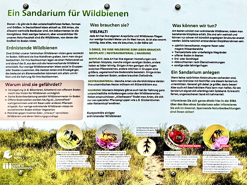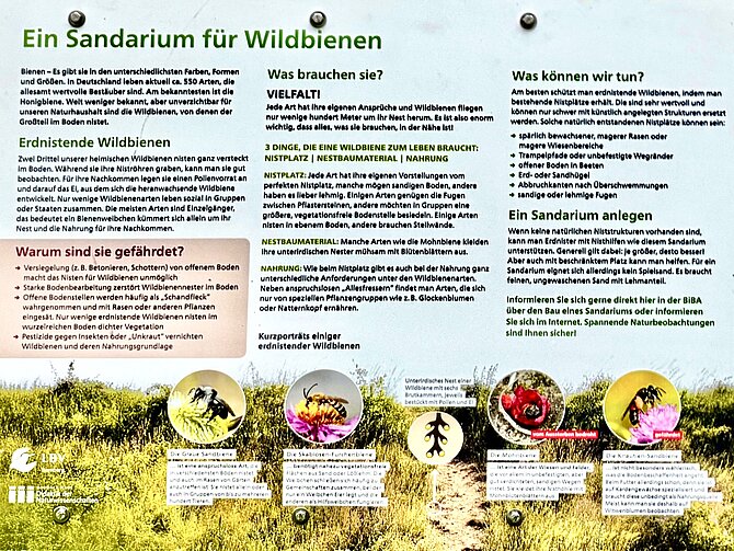 Ein "Sandarium" bietet den Wildbienen einen vegetationsfreien, sandigen Nistplatz an. Diese geschaffene Anlage ist eine Ergänzung zu dem sogenannten "Insektenhotel".
